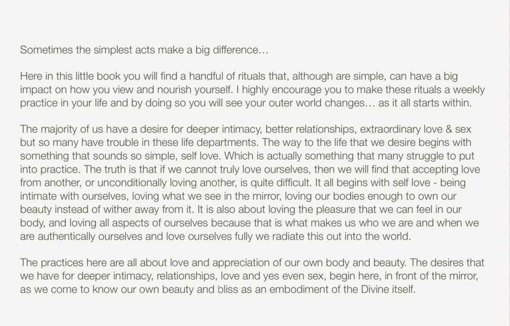 Here in this little book you will find a handful of rituals that, although are simple, can have a big impact on how you view and nourish yourself. I highly encourage you to make these rituals a weekly practice in your life and by doing so you will see your outer world changes... as it all starts within.